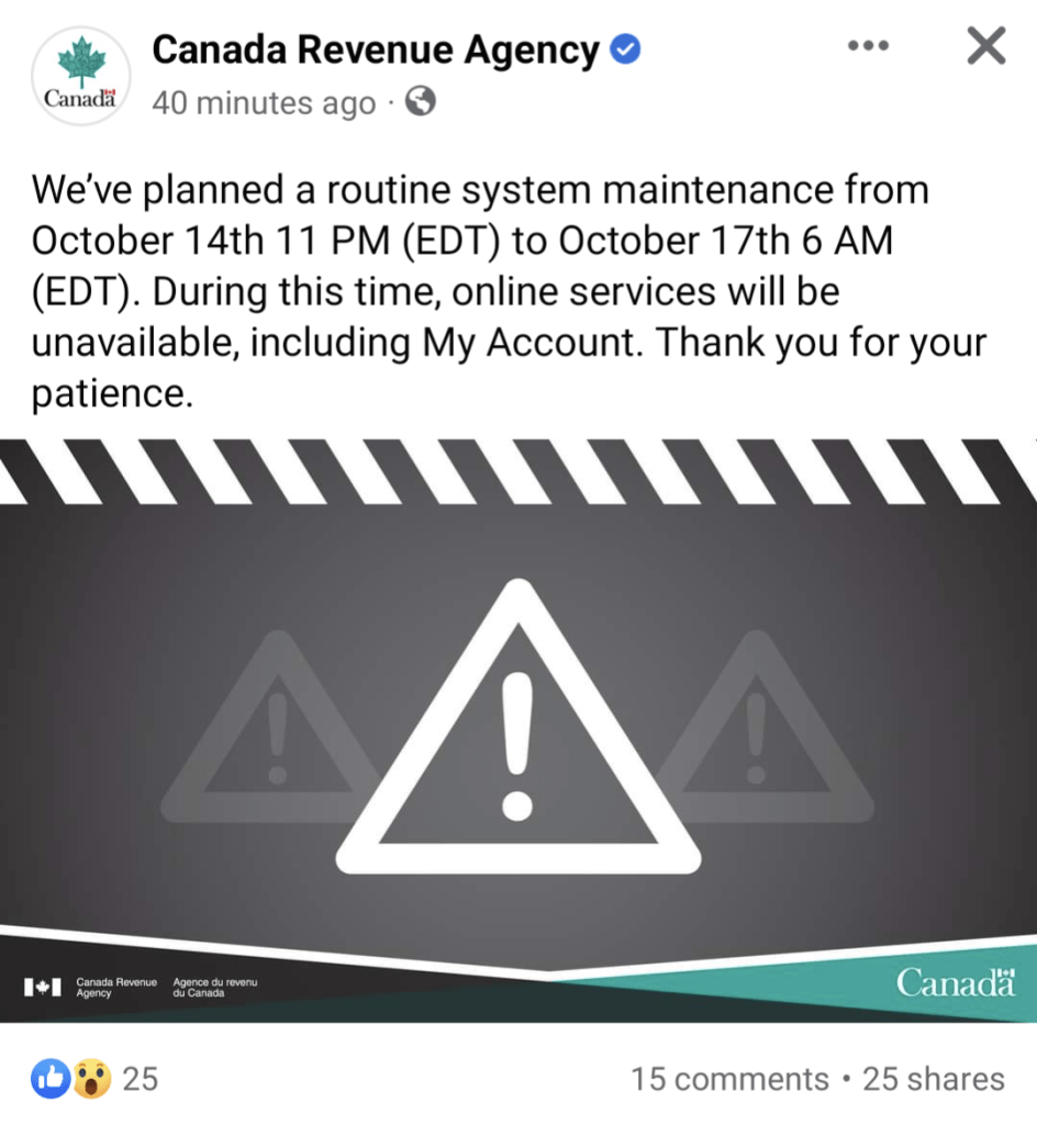 Heads up! If you need to check anything in your CRA My Account, you’ll need to do it today before 11pm or wait until Monday morning. Online services will be down this weekend as the CRA starts to get things ready for the upcoming new tax year.