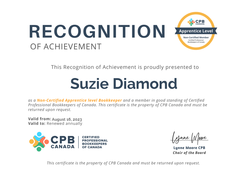 I’m very pleased to announce that I have completed all the necessary steps, including a knowledge test, to become an Apprentice level bookkeeper with the Certified Professional Bookkeepers of Canada. These designations and certifications are not required of bookkeepers in Canada, but it helps me to hone and maintain my professional skill-set, plus it helps clients know that they are hiring someone who has the needed understanding of bookkeeping concepts, awareness of current information relevant to bookkeepers, and a commitment to the field.